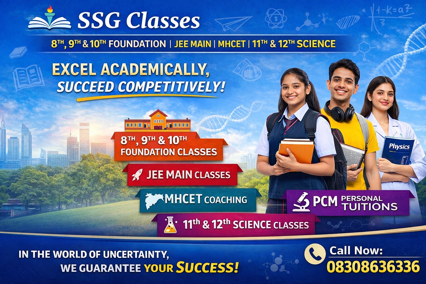 Welcome to SSG Classes, the most trusted destination for 8th, 9th & 10th Foundation Coaching Classes in Pimpri, along with expert preparation for JEE Main Classes, MHCET coaching, PCM Personal Tuitions, and 11th & 12th Science Classes in Pimpri.